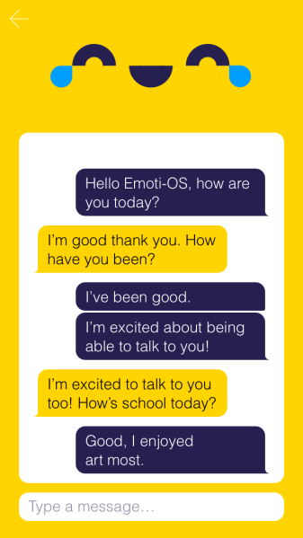 The purpose of the first iteration of Emoti-OS (13 Nov. – 19 Dec. 2017) was to determine the collective mood of Plymouth School of Creative Arts’s (UK) body of students by analysing the tone of their conversations with the chatbot, (a computer program that mimics conversation with people using artificial intelligence). It speculated whether a chatbot with a visual and emotionally driven character could engage and reflect the collective mood of a school in real time. Whilst doing so, could it also act as a channel for pupils and staff to express how they feel and see how others feel, in real-time, about their learning environment.