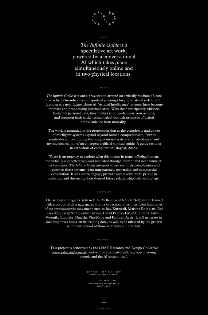 The Infinite Guide is a speculative art work, powered by a conversational AI, (a natural language human-computer interface), which took place simultaneously online and in two physical locations; at FACT in Liverpool and at KARST in Plymouth where it culminated in an exhibition and concluded with a program of public talks and workshops.
